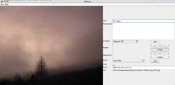 The system consists of two parts: a desktop application for building the topic map, and a web application for displaying the result. The desktop application is built in Jython using Swing and the OKS. It's a quite simple application that allows me to scan any directory for new photos, and extracts the time each photo was taken from the EXIF metadata in the JPEG file.