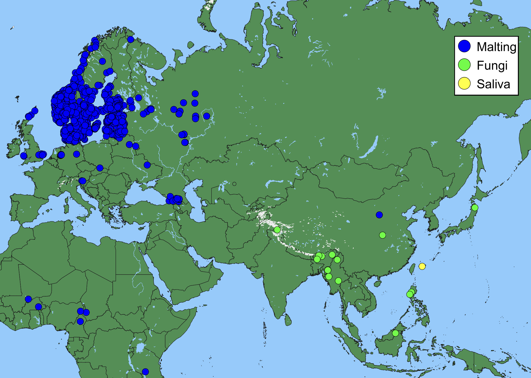 And what saccharification method did the Africans choose? They chose malting. African farmhouse brewing is still based on malting (visible in the same dot map as Eurasia), and I've seen no sign of other methods anywhere on the continent.
